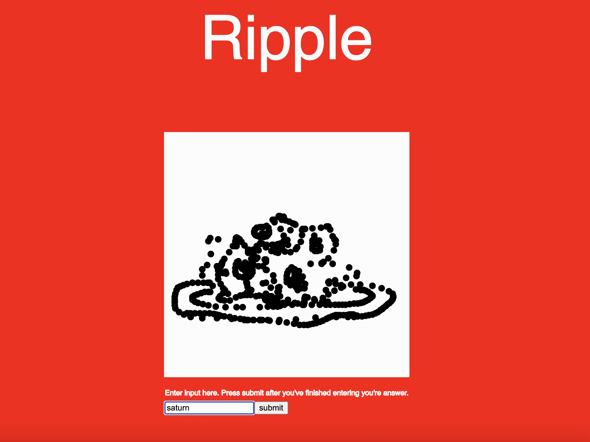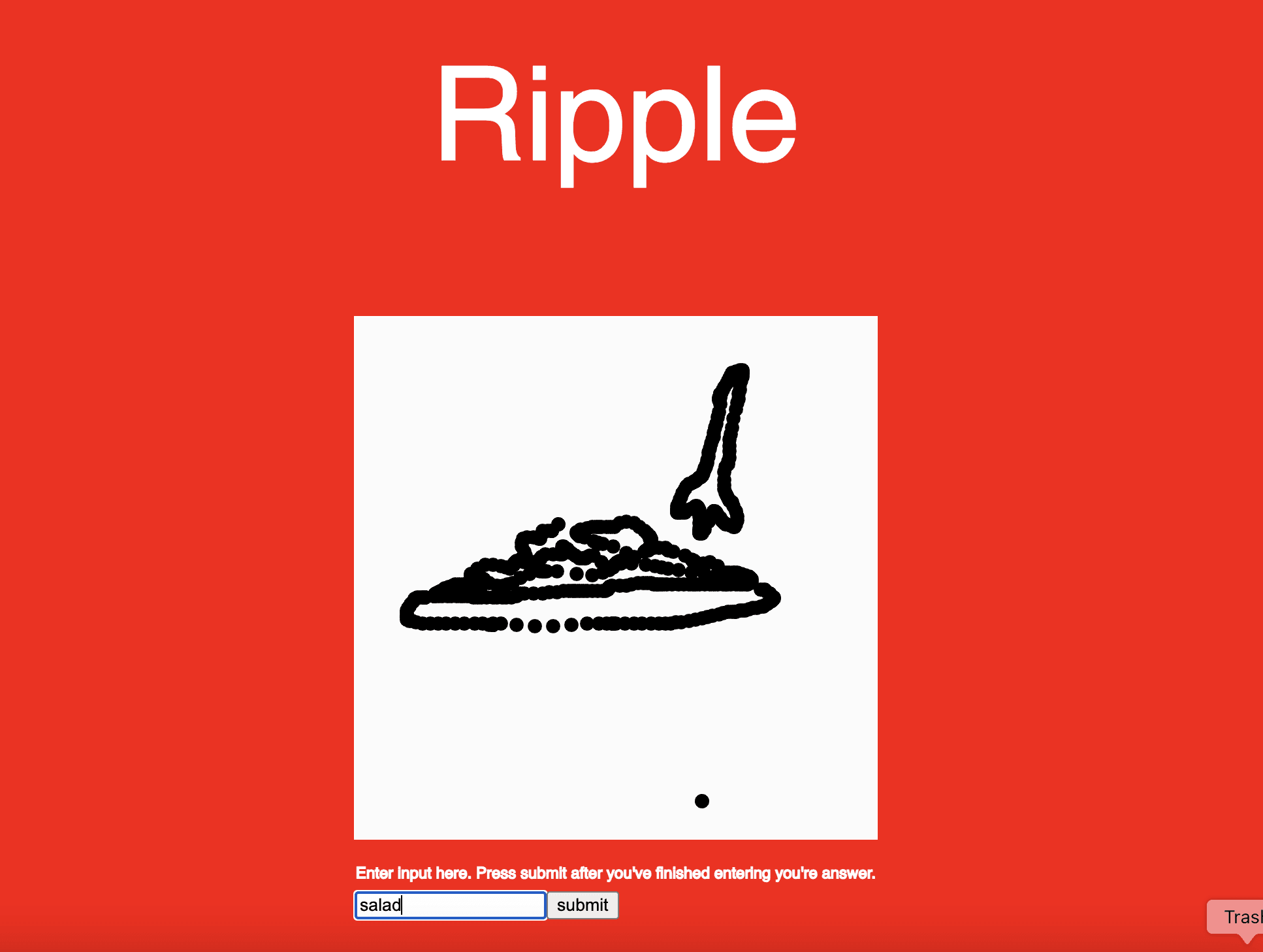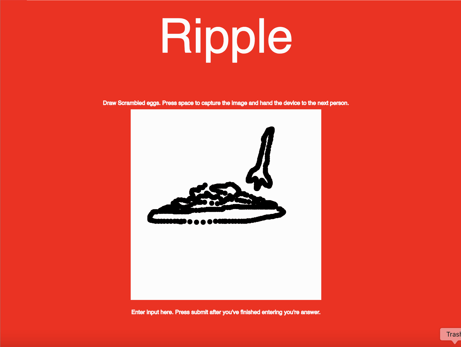 I designed an 8 player game called Ripple - the perfect combination of Telephone and Pictionary. The first user has to draw a visual representation of the computer-prompted word on the canvas. The prompt disappears the laptop gets passed and the second person has to guess what the previous player drew. The next player has to draw a visual representation of what the previous person guessed. The cycle repeats itself until the computer reaches the last person. The best part - the end of the game, players can compare the last drawing to the first prompt.
